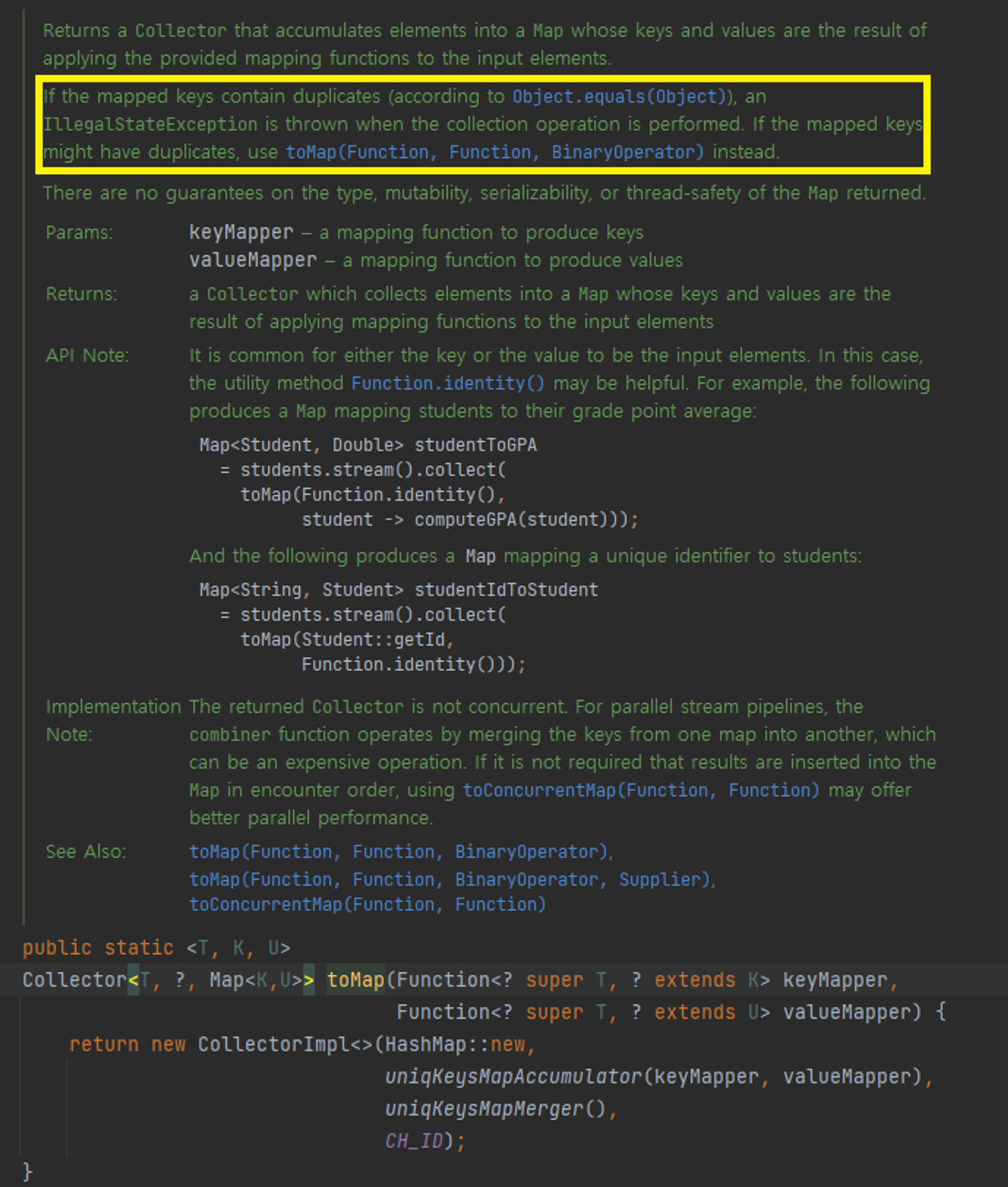 노란색으로 표시해둔 이 부분을 살펴보면 매핑된 key가 중복되면 IllegalStateException가 발생할 수 있다고 하며, 만약 key가 중복될 가능성이 있는 경우에는 toMap(Function, Function, BinaryOperator)을 대신 사용하길 권장한다.